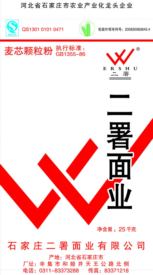 河北面業         二署面業有限公司創建于1989年,現已具備日處理小麥300噸的能量,產品質量穩定,深受客戶青睞。 二署面業地理位置優越,北靠307國道石黃高速,南鄰石德鐵路,衡井國道,交通十分方便,為貨物運輸提供保證及時運輸的天然條件。產品運銷:黑龍江、吉林、遼寧、河北、內蒙、陜西、山西等大中省份,贏得了廣大消費者的認可。 河北面業